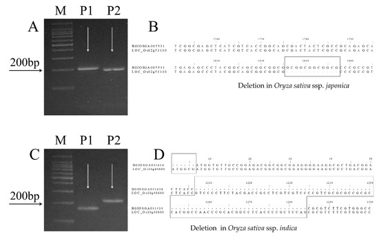 After their exposure to potassium chlorate (0.1%), parental rice lines 93-11 (P1) and Milyang352 (P2) showed distinctive phenotypic responses toward KClO3, sensitive and tolerant, respectively. We were further interested to investigate the presence of resistance alleles of previously reported genes controlling chlorate resistance in plants, such as nitrate reductase (NR) and nitrate transporter (NRT) [8,10], using the InDel markers, OsNR-IND2194 and OsNRT-M10-22. The genotyping results of parental lines indicated that both the InDel markers amplified polymorphic bands between the parental lines. OsNR-IND2194 amplified a band size of 200 bp in 93-11 (P1) and 188 bp in Milyang352 (P2) (Figure 6A). OsNRT-M10-22 amplified polymorphic bands of 165 bp in 93-11 and 213 bp in Milyang352 (Figure 6C,D). The amplified band sizes matched the deletion of nucleotides observed through in silico analysis of NR- and NRT-coding sequences (CDS) in indica and japonica databases (Figure 6B,D).