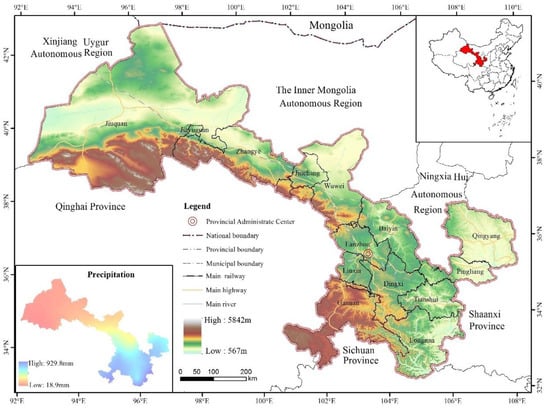 Gansu Province is located in northwestern China (92°13′–108°46′ E and 32°31′–42°57′ N). It is in the junction area of China’s northwestern arid region, Qinghai-Tibet alpine region and eastern monsoon region (Figure 1). The total land area of Gansu Province is 42.58 × 104 km2, accounting for 4.72% of China’s total land area. Its landforms are complex and diverse, with the crisscross distribution of mountains, plateaus, plains, river valleys, deserts and Gobi. Gansu Province as a whole has a narrow and long shape, with a length of 1655 km from east to west and a length of 530 km from north to south. The elevation of the terrain decreases from southwest to northeast. The area of plateau accounts for about 70% of the total land area of the province. Since Gansu Province is located in inland China, the warm moist airflow from the ocean can hardly reach this region. As a result, the precipitation is low. The annual precipitation is only 36.6–734.9 mm and declines from southeast to northwest. Besides, about 50–70% of the precipitation is concentrated in June to August. The climate in most areas of Gansu Province is dry and belongs to the continental temperate monsoon climate. The annual average temperature is 0–15 °C. The province’s frost-free period varies from region to region. For the Longnan River Valley, the frost-free period is around 280 days. For the Gannan Plateau, the frost-free period is the shortest, only 140 days. The rivers in Gansu Province are branches of exorheic rivers, including the Yangtze River and the Yellow River, as well as inland rivers, with river basin areas accounting for 8%, 32% and 60%, respectively, of the province’s area. There are many types of vegetation, such as forest, bush, grassland, meadow, cushion vegetation, sparse vegetation on alpine rock slopes, swamp vegetation, aquatic vegetation, etc. The plant resources in Gansu Province are relatively rich.