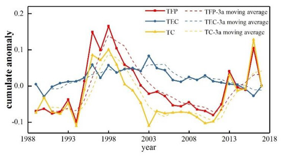 The trend of the cumulative anomaly of agricultural TFP, TEC, and TC with time in Gansu Province.