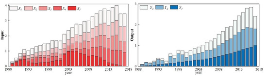 where xt and xt+1 are input factors in the periods t and t + 1, respectively; yt and yt+1 are output factors in the periods t and t + 1, respectively; Dt(xt, yt) and Dt(xt+1, yt+1) are input distance functions of decision units in t and t + 1 periods, respectively; Dt(xt+1, yt+1) and Dt+1 (xt, yt) are input distance functions of decision unit in different periods; Dc and Dv are distance functions based on constant scale returns and variable scale returns, respectively, which are the effective function values of the investment-oriented DEA model [38,39]. If PEC (SEC or TC) > 1, it means that the pure technological efficiency (scale efficiency or technology) is improved. If PEC (SEC or TC) = 1, it means that the pure technological efficiency (scale efficiency or technology) remains unchanged. If PEC (SEC or TC) < 1, it means that the pure technological efficiency (scale efficiency or technology) is decreased.