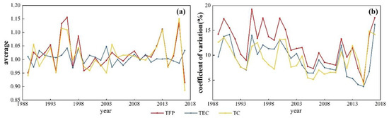 Trends of (a) agricultural TFP, TEC, and TC of Gansu Province and (b) their coefficients of variation with time.