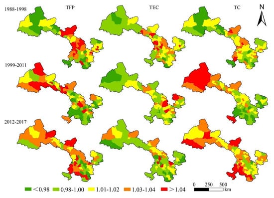 In Gansu Province, significant spatial variation of TFP, TEC, and TC was observed in all three periods (Figure 5). The areas with medium and high TFP values expanded from the central part to western part and then to the entire region of the province. In 1988–1998, TFP showed a spatial pattern of “high value in the middle and low value in the east and west”. Among the 87 counties, 63 (72.41%) showed TFP values greater than 1. In 1999–2011, the spatial difference in TFP between east and west of Gansu Province increased. TFP showed a spatial pattern of “high value in the west and low value in the east”, and the TFP value decreased in general. The number of counties with TFP value greater than 1 decreased to 42. The TFP value of central region decreased significantly, while that of western region increased significantly. In 2012–2017, the TFP values increased significantly compared with those in the previous stage. The number of counties with TFP value greater than 1 increased to 59, accounting for 67.82% of all evaluation units.