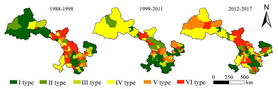 According to the classification criteria for agricultural development types, GIS spatial query tools were used to extract areas with TFP, TEC or TC lower than 1 in 1988–1998, 1999–2011, and 2012–2017. The agricultural development types of different regions were identified through overlay analysis (Figure 6). The agricultural development type showed significant spatiotemporal variation.
