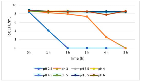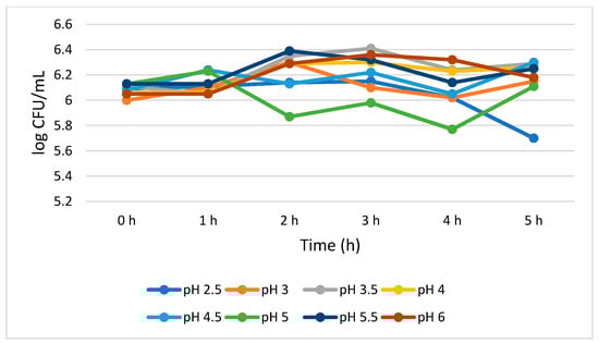 Figure 2 shows that S. cerevisiae demonstrated a better survivability than L. plantarum both at lower and higher pH values. S. cerevisiae showed consistent viability from 0 to 4 h with a 0.07 log CFU/mL growth reduction at pH 2.5. However, at pH 3.0, the growth of S. cerevisiae was insignificantly (p > 0.05) increased (0.15 log CFU/mL) during the 5 h treatment. At pH 4.0, 4.5, 5.5, and 6.0, the total viable cells was 6.26, 6.30, 6.25, and 6.18 log CFU/mL, respectively, at 5 h. At pH 5.0, a mixed trend on the total number of viable cells was observed, but overall, no significant growth reduction (0.02 log CFU/mL) was noted between 0 and 5 h.