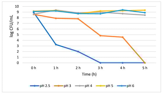 Acid tolerance of B. longum measured at different pH ranges from 2.5 to 6.0.