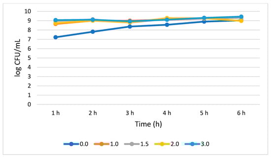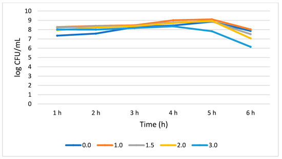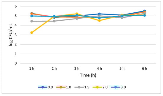 Figure 4 shows that L. plantarum tolerated different concentrations of bile salt without compromising its growth during the 6 h treatment period. A 0.51 log CFU/mL growth increase (p > 0.05) was observed for the bile salt control (0%) at 6 h, while a not statistically significant (0.05) growth reduction of 0.25, 0.71, 0.88, and 1.86 log CFU/mL was recorded at 1.0%, 1.5%, 2.0, and 3.0% bile concentrations, respectively. Interestingly, in all the tested bile concentrations, the highest number of viable cells was observed at 5 h while the lowest was observed at 6 h.