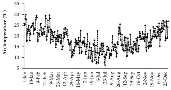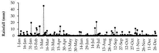 The daily air temperature and rainfall data were collected using an automatic weather station (Weather Link, Davis Instruments Corp, California, USA) located at the University of Fort Hare research farm. The daily average air temperature and daily total rainfall for the duration of the study are presented in Figure 1 and Figure 2, respectively. The highest daily mean air temperature was in the summer season in January (29.8 °C), and the lowest was observed in the winter season (6.5 °C) in July. Rainfall was received throughout the year, but it fluctuated. The highest daily average rainfall was recorded in March (45.4 mm).