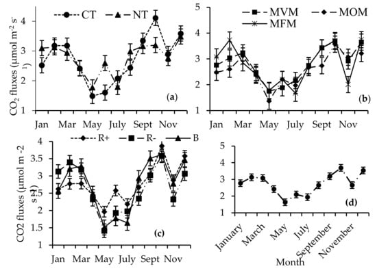 Generally, the CO2 fluxes were higher in the summer (October–February) compared to the winter months (May–July), irrespective of the treatment factors (Figure 5). The carbon dioxide fluxes were significantly higher in CT relative to NT in the month of October (Figure 5a). In contrast, significantly higher fluxes were observed under NT in June and January. In February, the MFM treatments had 30% and 23% higher CO2 fluxes relative to the MOM and MVM treatments, respectively, (Figure 5b), while in November the CO2 fluxes recorded in the MFM were 35% and 31% lower relative to the MOM and MVM treatments. The crop residue removals (3.13 µmoL m−2 s−1) resulted in significantly higher CO2 fluxes relative to both the B (2.57 µmoL m−2 s−1) and R+ (2.62 µmoL m−2 s−1) treatments in January (Figure 5c). In June, R+ (2.58 µmoL m−2 s−1) had significantly higher CO2 fluxes compared to both the B (1.78 µmoL m−2 s−1) and R− (1.93 µmoL m−2 s−1) treatments (Figure 5c). Significantly low CO2 flux emissions were recorded during the winter season compared to the summer period (Figure 5d).