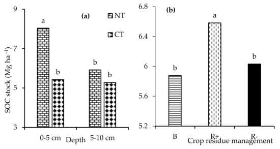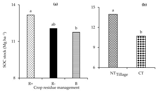 The effect of (a) retention (R+), biochar (B), and crop residue removal (R−) and (b) no-till (NT) and conventional tillage (CT) on the total SOC stock. Different letters indicate significant differences amongst the treatments.