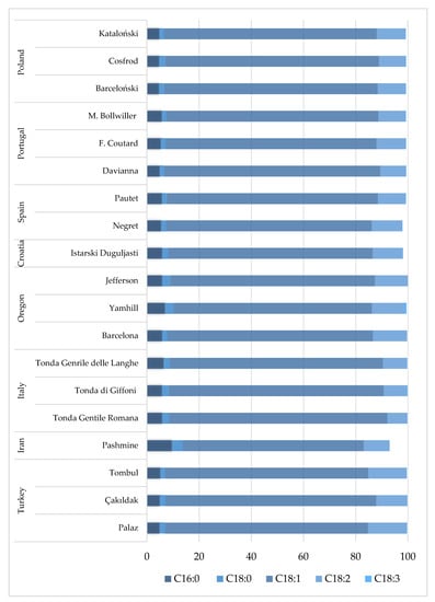 According to current reports, hazelnuts from Italy, Portugal, and Poland should show the best shelf-life quality parameters [9,34,54]. Cittadini et al. [58] showed that the oleic acid concentration in hazelnut exhibits minor variations among geographical provinces, which is inconsistent with our findings, where the values vary differently and depend on the geographical origin. Similarly, Tüfekci and Karataş [66] reported that it is possible to determine the geographical origin of Turkish hazelnut cultivars based on the differences between SFA (saturated fatty acids) and PUFA (polyunsaturated fatty acids) concentrations. Palmitic (C16:0) and stearic (C18:0) acids show the highest percentage in the cultivar from Iran (Pashmine), 9.60% and 4.10%, respectively [33], whereas other cultivars are comprised of lower ranges (4.80–6.52% and 1.75–3.4% for palmitic and stearic acids, respectively). Linolenic acid (C18:3) is observed at a very low amount in each cultivar (under 0.5%).
