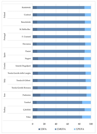 As expected, monounsaturated fatty acid (MUFA) is the principal group of fatty acids, followed by polyunsaturated fatty acids (PUFA) and saturated fatty acids (SFA) (Figure 2). The total percentage of SFA is observed in the lowest proportion of hazelnut cultivars from Poland and Portugal, 7.02–7.67% and 6.97–7.77%, respectively, whereas the highest is found in the hazelnut cultivar from Iran (13.11%) [9,33,34]. Hazelnut from Europe possesses the lowest SFA content in comparison to other cultivars. The total MUFA shows the lowest concentration in the hazelnut from Turkey (77.81–80.90%) and Iran (79.3%), whereas the highest are found in cultivars from Italy (81.92–83.91%), Portugal (81.60–83.05%), and Poland (81.74–82.15%) [9,27,33,34,54]. In cultivars from Turkey are displayed the highest percentage content of PUFA (12.70–15.12%) and cultivars from Italy show the lowest concentration (7.66–9.35%) [27,54], whereas in other cultivars, the PUFA concentration is within narrower ranges (10.00–11.24%). The highest UFA/SFA ratio is observed for cultivars from Poland (12.04–13.25) and Portugal (11.87–13.35), and the lowest in the Pashmine (Iran) cultivar (6.81). The higher the UFA/SFA ratio, the higher the nutritional value of nuts. Bacchetta et al. [54] reported that the major fatty acid is oleic acid in 75 hazelnut oils from different cultivars with an average value of 80.63%, which is inconsistent with our findings.