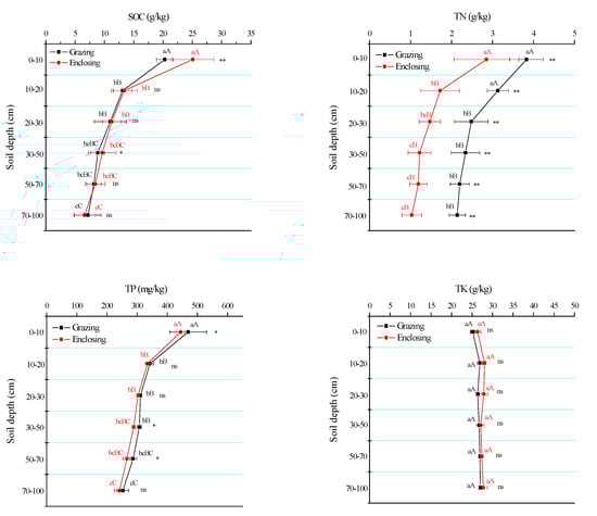 The effects of long term grazing and enclosing on the contents of soil SOC, TN, TP and TK. Note: * and ** indicate significant differences at p < 0.05 level and p < 0.01 level of SOC, TN, TP and TK contents in each soil layer between the long term grazing plot and the long term enclosing plot and ns indicates no significant difference (t test). Different lower case and capital letters indicate significant differences at p < 0.05 level and p < 0.01 level of SOC, TN, TP and TK contents among different soil layers for the long term grazing plot or the long term enclosing plot by one-way analysis of variance (ANOVA). Error bars were one standard deviation.