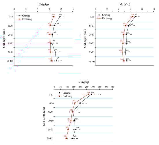 The effects of long term grazing and enclosing on soil contents of Ca, Mg and S. Note: * and ** indicate significant differences at p < 0.05 level and p < 0.01 level of Ca, Mg and S contents in each soil layer in the long term grazing plot and the long term enclosing plot and ns indicates no significant difference (t test). Different lower case and capital letters indicate significant differences at p < 0.05 level and p < 0.01 level of Ca, Mg and S contents among different soil layers for the long term grazing or the long term enclosing by one-way analysis of variance (ANOVA). Error bars were one standard deviation.
