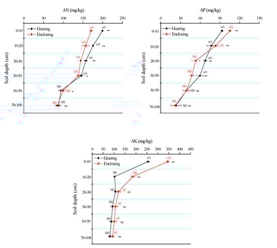 The effects of long term grazing and enclosing on contents of soil AN, AP and AK. Note: * and ** indicate significant differences at p < 0.05 level and p < 0.01 level of AN, AP and AK contents in each soil layer between the long term grazing plot and the long term enclosing plot and ns indicates no significant difference (t test). Different lower case and capital letters indicate significant differences at p < 0.05 level and p < 0.01 level of AN, AP and AK contents among different soil layers for long term grazing or long term enclosing by one-way analysis of variance (ANOVA). Error bars were one standard deviation.