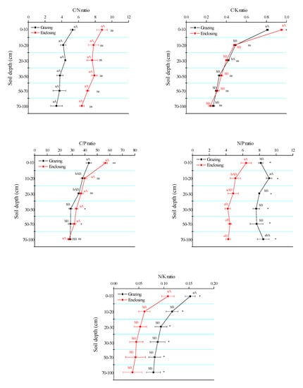 Long term enclosing increased the C/N ratio in each soil layer compared with long term grazing and was 39.9%, 46.4%, 42.0%, 52.2%, 47.3% and 47.5% higher in 0–10 cm, 10–20 cm, 20–30 cm, 30–50 cm, 50–70 cm and 70–100 cm soil, respectively (Figure 4). Long term enclosing increased the C/P ratio and C/K ratio in the surface soil and was 23.4% (p < 0.01) and 15.2% (p < 0.05) higher in 0–10 cm soil compared with long term grazing. The C/P ratios and C/K ratios decreased with the increase of soil depths in the long term grazing plot and the long term enclosing plot and were significantly higher (p < 0.01) in 0–10 cm soil rather than other soil layers. In 0–10 cm soil, the C/P ratio in the long term grazing plot and the long term enclosing plot was 13.0% and 41.2% higher than 10–20 cm soil, respectively and the C/K ratio was 65.8% and 99.5% higher, respectively. Long term enclosing significantly decreased the N/P ratio and was 27.4%, 78.4%, 64.1%, 80.5%, 71.6% and 97.8% higher in 0–10 cm, 10–20 cm, 20–30 cm, 30–50 cm, 50–70 cm and 70–100 cm soil compared with long term grazing. The N/P ratio in the long term enclosing plot was the highest in 0–10 cm soil and the N/P ratio in the long term grazing plot was the highest in 10–20 cm soil. The N/K ratio in the surface soil was obviously higher than in other soil layers and it was slightly lower in the long term enclosing plot relative to the long term grazing plot.