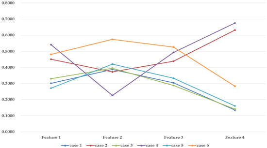 The association table contains the interconnection between past cases. Within the case base, a case could be similar or dissimilar to several other cases. An example of a case base is given in Table 2, including six past cases. Each case has four features. After data normalization [45], all the cases are visualized in Figure 1.