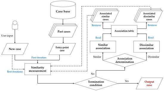 In Figure 2, the case retrieval algorithm firstly starts with the new case input by users. An entry point is randomly selected from the case base for comparison in the first iteration. Based on the similarity measurement, the algorithm decides whether the new case is similar (or dissimilar) to the entry-point case. Afterwards, the corresponding association is determined and associated similar (or dissimilar) cases are read and retrieved from the association table. Then, the similarity between the new case and associated similar (or dissimilar) ones are measured in the next iteration, until the termination condition is reached. The termination condition of the algorithm is defined as—(i) the maximum iteration number is reached or (ii) a satisfied similar past case is found.