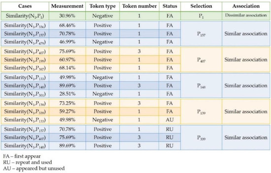 - Policy 4—Selection of previous cases—It happens that all associated cases in a single iteration have been compared previously due to the reason that a past case can be associated with a 1-to-N relation. For instance, in Table 3, case 5 has the similar association with cases 1 and 3. It makes no sense to repeatedly evaluate cases that have been already compared, resulting in an endless loop for the algorithm. Under this circumstance, the cases to be evaluated in the next iteration are selected from previous iterations. Based on the number of tokens, corresponding association is determined and the past case with the second highest (or lowest) similarity measurement from the previous iteration will be chosen for comparison. If the past cases in the previous iteration have all been selected, then the algorithm will repeat Policy 4 one more time.