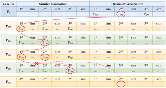 - Scenario 1—Updating the association of the new case—If a closer similar or dissimilar association with the new case is detected during runtime, this past case should replace the old ones (Figure 5a).