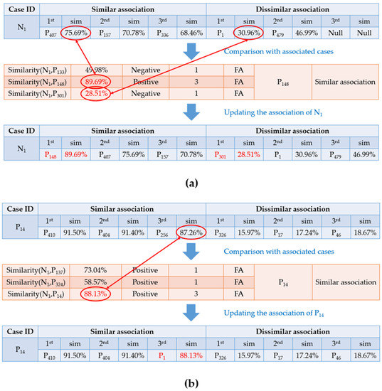 Figure 5. Examples of updating the association table: (a) scenario 1 and (b) scenario 2. - Scenario 2—Updating the association of the past cases—If the new case shows a closer association with the compared past case, the old association of this past case should be replaced by the new case (Figure 5b).