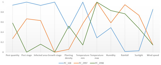 Figure 6 demonstrates that though both past cases 2997 and 2998 are dissimilar to the past case 328, they still have a major difference among data like pest stage, infected area and planting density. Actually, the similarity measurement between past cases 2997 and 2998 only achieves at 67.08%.