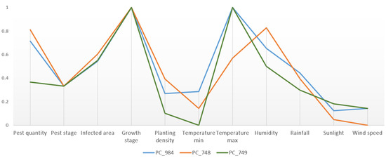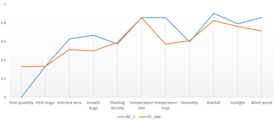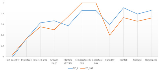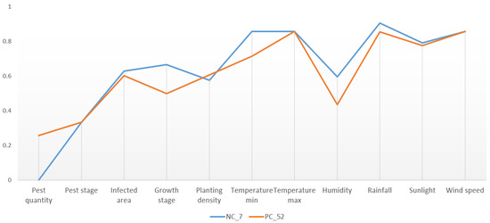 Contents of some features in Table 1 are given by texts, like “pest name,” “pest stage,” “crop name” and “growth stage.” To deal with these textual features, we encode them into integers. Transforming a linguistic feature into a real number is a common approach in case-based reasoning systems [43,44]. For example, the life cycle of pest includes “egg,” “pupae,” “larvae” and “adult.” An integer is assigned to each stage respectively. Thus, integer “1” represents “egg,” “2” represents “pupae,” “3” represents “larvae” and “4” represents “adult.” The same transformational process works for the rest of textual features as well. For normalization both numeric and textual features, we adopted the Min-Max feature scaling method, mapping the original features into the range from 0 to 1. Although, there are some interrelations between a single feature, such as the life cycle of pest follows a time sequence. The process of data normalization does not eliminate these interrelations, since the original values (1,2,3,4) would be normalized as (0,0.3333,0.6667,1), which also reflects the interrelations.