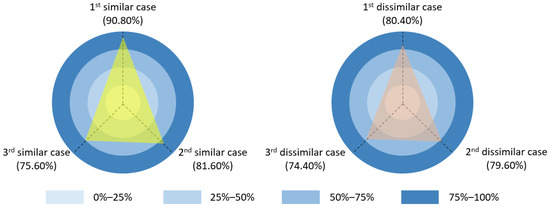 In Figure 8, the average precision of retrieved top three similar cases achieves at 90.52% (1,357,804/1,500,000), 82.11% (1,231,654/1,500,000) and 75.03% (1,125,449/1,500,000). The average precision of retrieved top three dissimilar cases achieves at 80.39% (1,205,858/1,500,000), 79.14% (1,187,119/1,500,000) and 75.91% (1,138,655/1,500,000). The result of the average precision demonstrates that the proposed case retrieval algorithm achieves promising retrieval accuracy. Meanwhile, the selection of the entry-point case has minor influence on the performance of the retrieval algorithm.