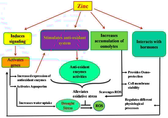 Mechanisms of drought tolerance induce by Zn. Zinc application improves the antioxidant activities, increases osmolyte accumulation, hormonal cross talk and cell signaling, which in turn improve membrane stability, physiological processes including water uptake and ROS scavenging.