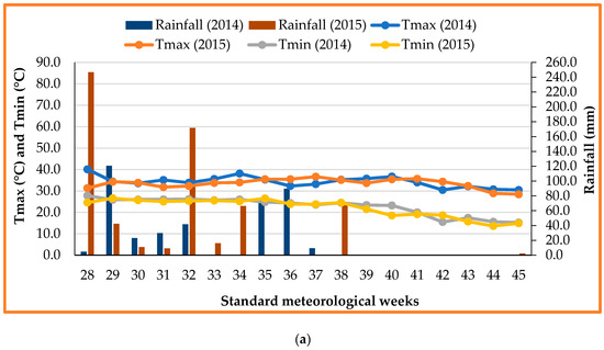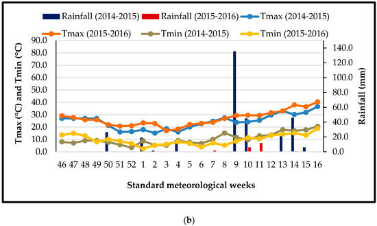 (a) Weekly meteorological data for the Kharif seasons maize crop (2014 and 2015); (b) Weekly meteorological data for the Rabi seasons wheat crop (2014–2015 and 2015–2016).