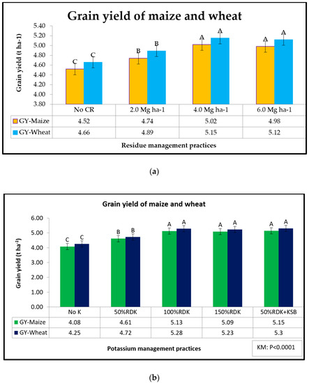 (a) Crop residue management on grain yield of maize and wheat under zero tillage maize–wheat system (pooled data of two years), GY: grain yield, CR: p < 0.0001; (b) Potassium management on grain yield of maize and wheat under zero tillage maize–wheat system (pooled data of two years), GY: grain yield.