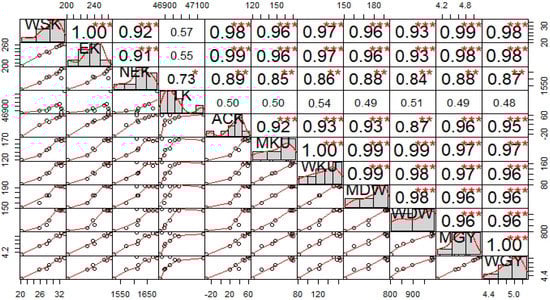 Correlation matrix of maize and wheat yield, K uptake, dry matter, actual K change and native soil K pools (*p ≤ 0.05; ** p ≤ 0.01; *** p ≤ 0.001). WSK: Water Soluble K, EK: Exchangeable K, NEK: Non-Exchangeable K, TK: Total K, ACK: Actual Change in K, MKU: Maize K Uptake, WKU: Wheat K Uptake, MDW: Maize Dry Weight, WDW: Wheat Dry Weight, MGY: Maize Grain Yield, and WGY: Wheat Grain Yield.