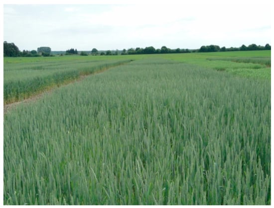 General view of the experiment. Winter wheat at the shooting stage (33–35 in the BBCH (Biologische Bundesanstalt, Bundessortenamt und Chemische Industrie) scale).