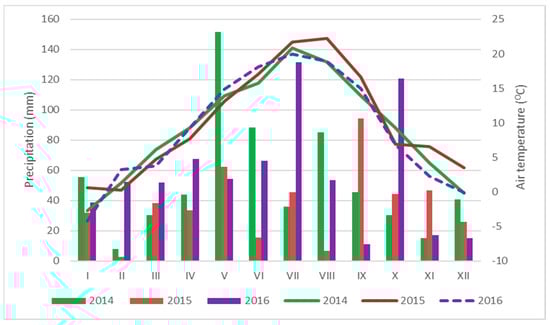 The experiment was established on the soil classified as Rendzic Phaeozem [36], with a sandy clay composition including 26% of silty fraction and 13% of dust fraction. This soil type has an alkaline pH, high contents of available phosphorus and potassium, and a medium content of magnesium. The growing season (the number of days with an average daily temperature above + 5 °C) spans for 210–215 days and begins in the second half of March. The following sums of precipitation were recorded in individual study years: 630 mm in 2014, 448 mm in 2015, and 681 mm in 2016 (Figure 3). Since the renewal of spring vegetation until winter wheat harvest (the first week of August), the sums of precipitations were as follows: 319 mm in 2014, 157 mm in 2015, and 320 mm in 2016. The highest monthly sums of precipitation were recorded in May—65 mm on average, June—73 mm, and July—80 mm, whereas the mean air temperatures recorded in the respective months were at 14.1, 17.3, and 19.5 °C. In the winter months, the sums of precipitation reached 30 mm on average in December, 23 mm in January, and 26 mm in February, whereas average air temperatures reached −1.8, −4.0, and −2.8 °C, respectively.