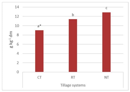Content of organic C in the 0–25 cm soil layer depending on the tillage system (average of 2014–2016). * a—Means denoted with the same letters do not differ significantly, p < 0.05.