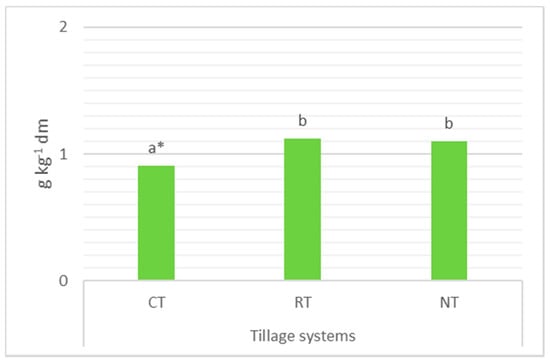 Content of total nitrogen in the 0–25 cm soil layer depending on the tillage system (average of 2014–2016). * a—Means denoted with the same letters do not differ significantly, p < 0.05.