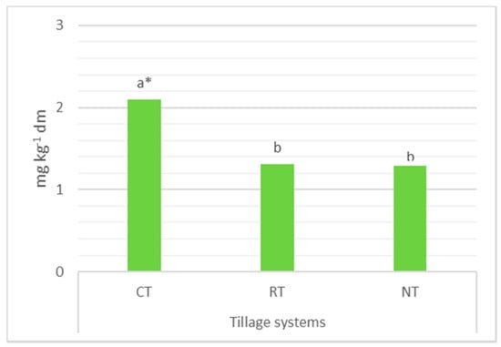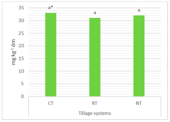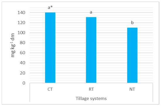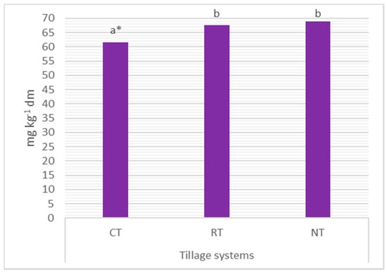 Content of magnesium (Mg) in the 0–25 cm soil layer depending on the tillage system (average of 2014–2016). * a—Means denoted with the same letters do not differ significantly, p < 0.05.