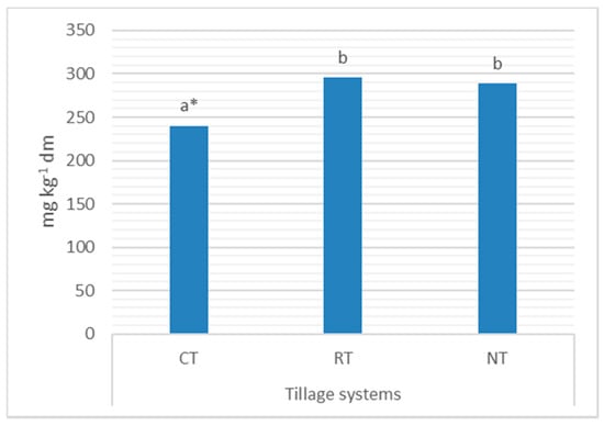 Content of potassium (K) in the 0–25 cm soil layer depending on the tillage system (average of 2014–2016). * a—Means denoted with the same letters do not differ significantly, p < 0.05.