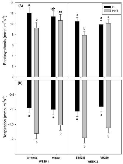 Net photosynthesis rates of LSWF for ST5288 were significantly lower compared to the control, after one and two weeks, of the treatment imposition (22% and 25%, respectively). In contrast, net photosynthetic rates of thermotolerant VH260, were not substantially affected (Figure 1A). Nevertheless, higher than optimum night temperatures, and markedly increased respiration rates of LSWF of both cultivars were obtained. Specifically, respiration rates were almost doubled compared to control for ST5288 at the end of the first week, while an 85% increase was observed at the end of the second week (Figure 1B). A similar pattern was also observed in LSWF respiration rates of VH260, where an 85% and 80% increase were observed at the end of the first and second week, respectively (Figure 1B).