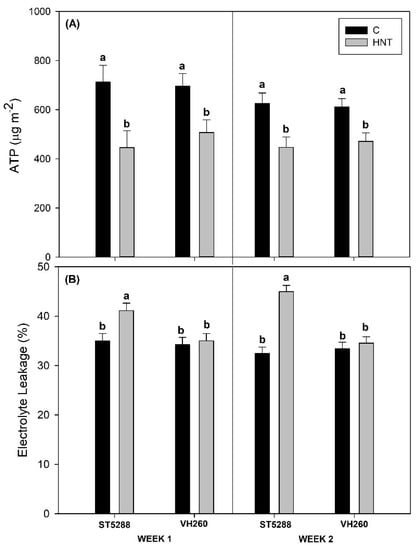 High night temperatures substantially decreased LSWF ATP levels of both cultivars. Specifically, after one week of stress, LSWF ATP levels of ST5288 and VH260 decreased by 37 and 27%, respectively, compared to the control, and similar decreases (29% and 23%) were observed at the end of the treatment (Figure 2A).