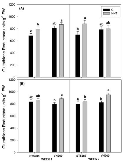 Higher than optimum night temperatures substantially increased LSWF glutathione reductase content of ST5288 by 15% and 26% at the end of the first and second week, respectively (Figure 3A). However, that was not observed in VH260 where LSWF glutathione reductase levels of heat-stressed plants remained similar to those of the control (Figure 3A). A differential pattern was observed in the glutathione reductase content of pistils, where no significant difference was detected in ST5288, but substantial increases (11% and 15%) were noted in VH260 at the end of the first and second week, respectively (Figure 3B).