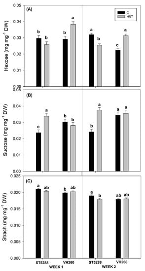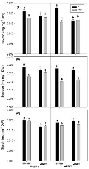 Higher than optimum night temperatures significantly decreased LSWF hexose content in ST5288 by 15% and 31% compared to the control, but had no effect on LSWF hexose content in VH260 (Figure 4A). LSWF sucrose levels of ST5288 were also substantially lower compared to the control after one and two weeks of high night stress imposition (24% and 34%, respectively) (Figure 4B). In contrast, LSWF sucrose levels of VH260 were not affected by the heat stress treatment by the end of the first week, but markedly decreased, by 26% compared to the control, after two weeks of high night temperatures stress (Figure 4B). In contrast to LSWF hexose and sucrose contents, no response to high night temperatures was observed on LSWF contents of ST5288 and VH260 at the end of the first week. However, LSWF starch contents of ST5288 and VH260 were lower by 7% and 9%, respectively, compared to the control by the end of the treatment (Figure 4C).