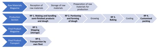 The boundaries of the food processing phase in the food supply chain have been assumed following the definition used in the FUSIONS project [,]. The entry point to the processing link is located at the gate to the processing plant, where raw materials are received. All sections, processes and actions within operating activity, which are performed in order to obtain a final product, were taken into account. The end-point of the processing cell is located at the gate, when the final products are leaving the processing plants.
