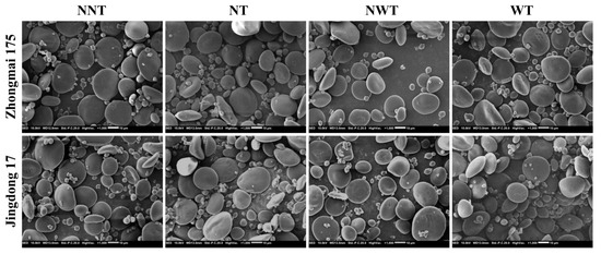 3.2. Effects of Reduced N Fertilization and Irrigation on the Morphology of Starch Granules