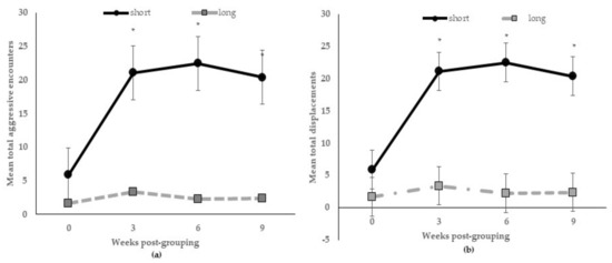 There were no interactive effects of diet by length on aggressive encounters at 24 h post-mixing or 3, 6, and 9 weeks post-grouping (p > 0.10), or other behaviors (p > 0.15) registered from 06:00 h to 08:30 h (included pre- and post-feeding time), but feeding stall partition length across weeks post-grouping occurred for aggressive encounters (p < 0.005) and displacements (p < 0.05). Figure 1a shows the total.