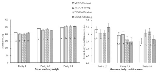 The only 3-way interactive effect of parity by diet by length occurred for mean body weight (p = 0.01) and BCS (p < 0.01), as shown in Figure 2. Parity categories 1 and 2, 3 sows in the MIDD-SY: short treatment were heavier than the sows in pens with long partitions (MIDD-SY: long). However, parity ≥ 4 sows in the MIDD-SY: long treatment were heavier (p < 0.005) than contemporaries in pens with short ones (MIDD-SY: short). Parity 1 sows in the DDGS-GM: long treatment was heavier than contemporaries in pens with short partitions (DDGS-GM: short). Conversely, the Parity 1 sows in the DDGS-GM: short treatment had higher BCS (p < 0.05) than contemporaries in the DDGS-GM: long or in MID-SOY: short treatments and sows in all other parity categories and treatments.