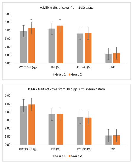 Figure 1. Milk characteristics of cows by milk lactose level. (A). 1–30.p.p., (B). From 30 d.p.p. until insemination. Group 1—milk lactose < 4.70%, Group 2—milk lactose ≥ 4.70%. MY—milk yield. F/P—milk fat/protein ratio. d.p.p—days post partum. The difference between the groups is statistically significant—* P < 0.005.