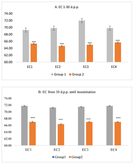 Figure 2. Electrical conductivity of cows’ milk at the level of udder quarters (μS/cm). (A). 1–30.p.p., (B). From 30 d.p.p. until insemination. Group 1—milk lactose < 4.70%, Group 2—milk lactose ≥ 4.70%. EC1—rear right, EC2—rear left, EC3—front right, EC4—front left. The difference between the groups is statistically significant—*** P < 0.001.