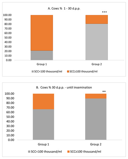 Figure 3. Relationship of milk somatic cell counts (SCC) with milk lactose level. (A). 1–30.p.p., (B). From 30 d.p.p. until insemination. Group 1—milk lactose < 4.70%, Group 2—milk lactose ≥ 4.70%. SCC—milk somatic cell count. The association between group and SCC of milk is statistically significant—** P < 0.01, *** P < 0.001.