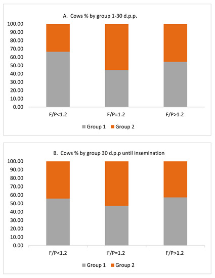Figure 4. Relationship of milk fat to protein ratio with milk lactose level. (A). 1–30.p.p., (B). From 30 d.p.p. until insemination. Group 1—milk lactose < 4.70%, Group 2—milk lactose ≥ 4.70%. F/P—milk fat/protein ratio.
