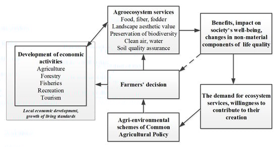Historically, agricultural systems have been primarily created for the production of food and fiber raw materials [1]. Nevertheless, they have a significant impact on the formation of cultural ecosystems and provision of different ecosystem services (ES) in rural areas: healthy and safe food, quality of surface water, air and soil, rich landscape, and biodiversity [2]. Agriculture is a managed or transformed or cultured ecosystem. Most food and other biological products are produced from agriculture as well as forestry, fishing, hunting, and harvesting activities [3]. Here, production is the use of man-made ecosystems and the use of natural ecosystem elements. In this context, according to Christiansen (1979) [3], agricultural systems are referred to as the agroecosystem, and the outputs delivered by them are referred to as the AES. The agroecosystem is the only ecosystem directly managed by people in order to meet own needs [4].